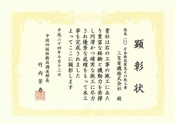 『徳島(21)庁舎新設電気その他工事』において、中国四国防衛局より「顕彰状」をいただきました。